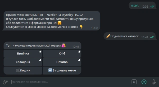 Для клієнта було розроблено Telegram-бот із адміністративною панеллю, який дозволяє автоматизувати прийом замовлень, керування каталогом продукції та обробку заявок без участі операторів. Рішення орієнтоване на швидке обслуговування клієнтів і просте управління для бізнесу.