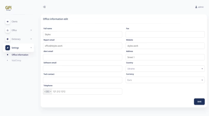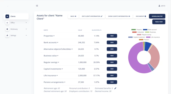 Система зберігає повну інформацію про клієнтів, їх активи та документи. Доступне редагування, додавання нових записів і формування PDF-звітів.