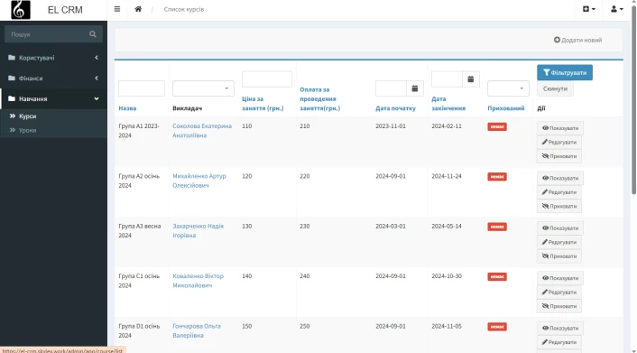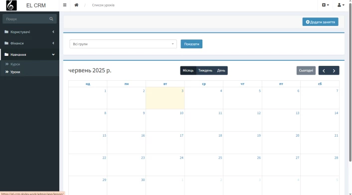 Навчальний модуль відповідає за організацію всіх освітніх процесів: створення та редагування курсів, управління групами й індивідуальними заняттями, відображення розкладу в інтерактивному календарі з фільтрами за викладачами та групами. Система фіксує присутність учнів, пропуски та дозволяє гнучко редагувати чи переносити заняття відповідно до змін у графіку.