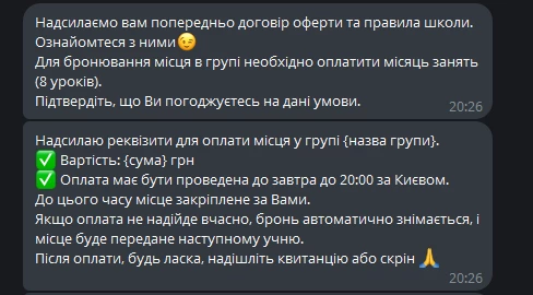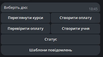 Коли учень сплатив, менеджер може швидко зафіксувати це через Telegram-бот. Менеджер обирає транзакцію зі списку платежів, що очікують оплати, і змінює статус на «Оплачений» з збереженням фактичної дати оплати.