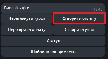 Менеджер може прямо в боті ініціювати створення платежу для конкретного учня на конкретному курсі. У боті вибирається курс, потім учень зі списку учнів цього курсу, після чого система створює транзакцію зі статусом «Виставлений». Дані записуються у CRM автоматично, без можливості редагувати їх у боті.