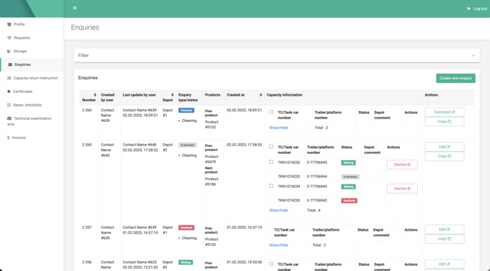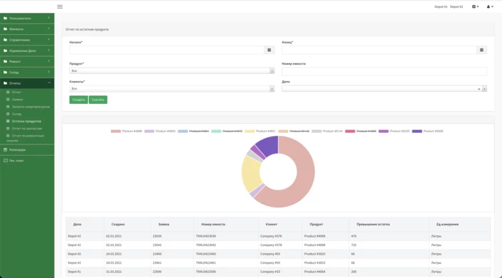 Створено унікальний модуль для управління складом. По суті, це карта з комірками, де можуть зберігатися танк-контейнери. Таким чином, працівник на навантажувачі може візуально визначити, де знаходиться танк-контейнер. Карта також має можливість пошуку за номером ТК. У цьому модулі працівники можуть переміщати контейнери з однієї комірки в іншу, додавати або видаляти комірки. Карта має кольорове кодування, що дозволяє візуально визначити статус комірки. Інформація з цього модуля також інтегрується в інші частини проекту. Також на основі інформації з модуля "Склад" формуються звіти для керівництва.
