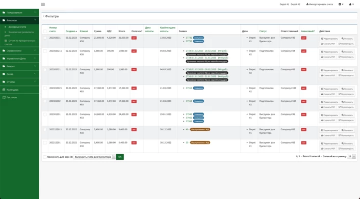 Модуль замовлень дозволяє керувати основними процесами компанії. З цим модулем працюють співробітники. Наразі цей модуль максимально автоматизує роботу, щоб зменшити кількість помилок та кількість часу, що витрачається на обробку замовлень. В системі є ще два аналогічні модулі для обліку ремонтів та модуль для групування всіх видів робіт в одному місці для зручності виконання.