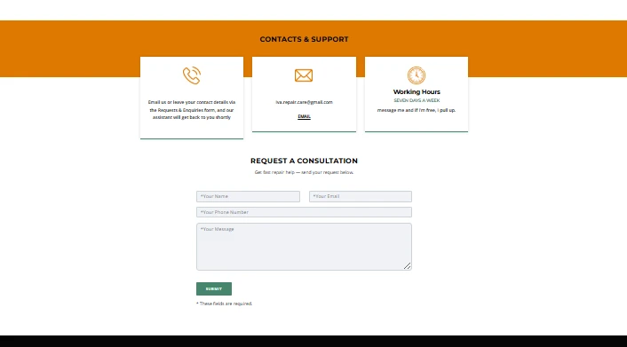 У блоці контактів розміщено email для зв’язку, форму зворотного зв’язку та інформацію про години роботи сервісу, що забезпечує зручну комунікацію з клієнтами.