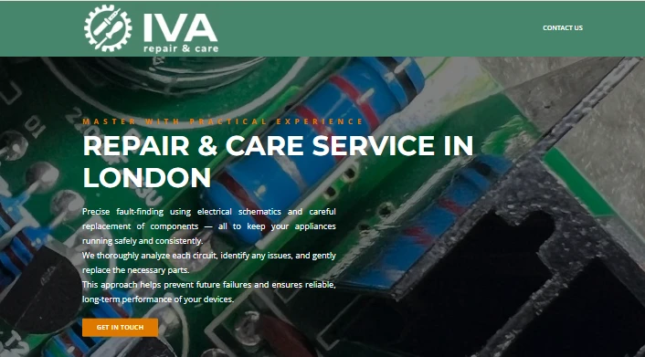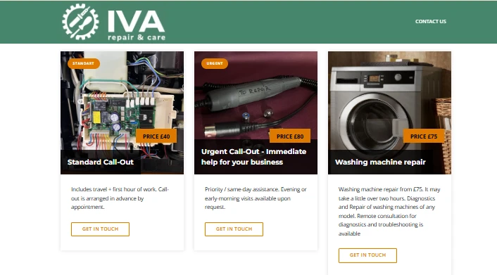 На сайті представлені основні послуги сервісу, зокрема Standard Call-Out, Urgent Call-Out, Washing Machine Repair та інші сервісні роботи. Для кожної послуги вказано короткий опис, орієнтовну вартість та кнопку Get in touch, що дозволяє швидко залишити заявку.