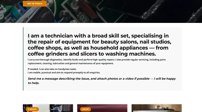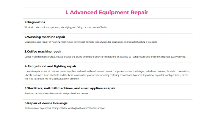 У цьому розділі представлено опис спеціалізації майстра, перелік обладнання, з яким працює сервіс, а також формат роботи — виїзд до клієнта, попередня діагностика та виконання ремонтних робіт. Блок формує довіру та пояснює, як саме відбувається обслуговування.