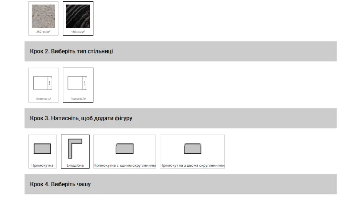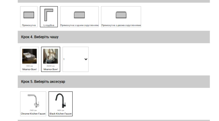 Користувач проходить покрокову конфігурацію виробу, обираючи матеріал стільниці, тип і товщину, форму, додаткові елементи та аксесуари. Всі зміни миттєво впливають на візуалізацію та фінальну вартість.