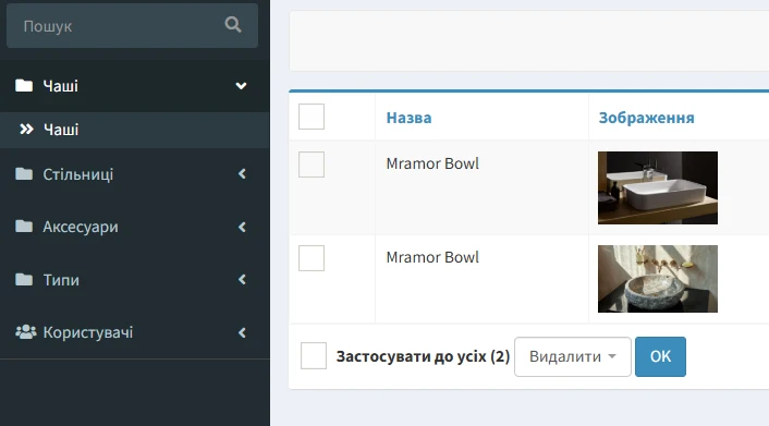 Адміністративна панель забезпечує повний контроль над роботою системи та контентом проєкту. Через неї адміністратор може додавати, редагувати та видаляти товари, групи товарів, аксесуари та інші елементи каталогу, керувати користувачами та їхніми правами доступу, а також оновлювати ціни, зображення й описові дані. Інтерфейс побудований у зрозумілому табличному форматі з фільтрами та швидкими діями, що дозволяє оперативно вносити зміни без залучення розробників і підтримувати актуальність даних у системі.