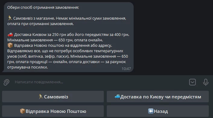 Для клієнта було розроблено Telegram-бот із адміністративною панеллю, який дозволяє автоматизувати прийом замовлень, керування каталогом продукції та обробку заявок без участі операторів. Рішення орієнтоване на швидке обслуговування клієнтів і просте управління для бізнесу.